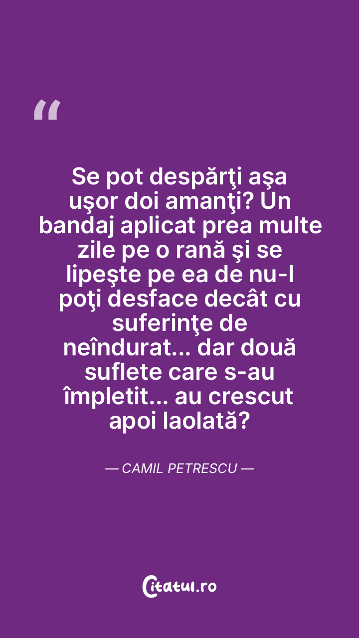 Se pot despărţi aşa uşor doi amanţi? Un bandaj aplicat prea multe zile pe o rană şi se lipeşte pe ea de nu-l poţi desface decât cu suferinţe de neîndurat... dar două suflete care s-au împletit... au crescut apoi laolată? Camil Petrescu