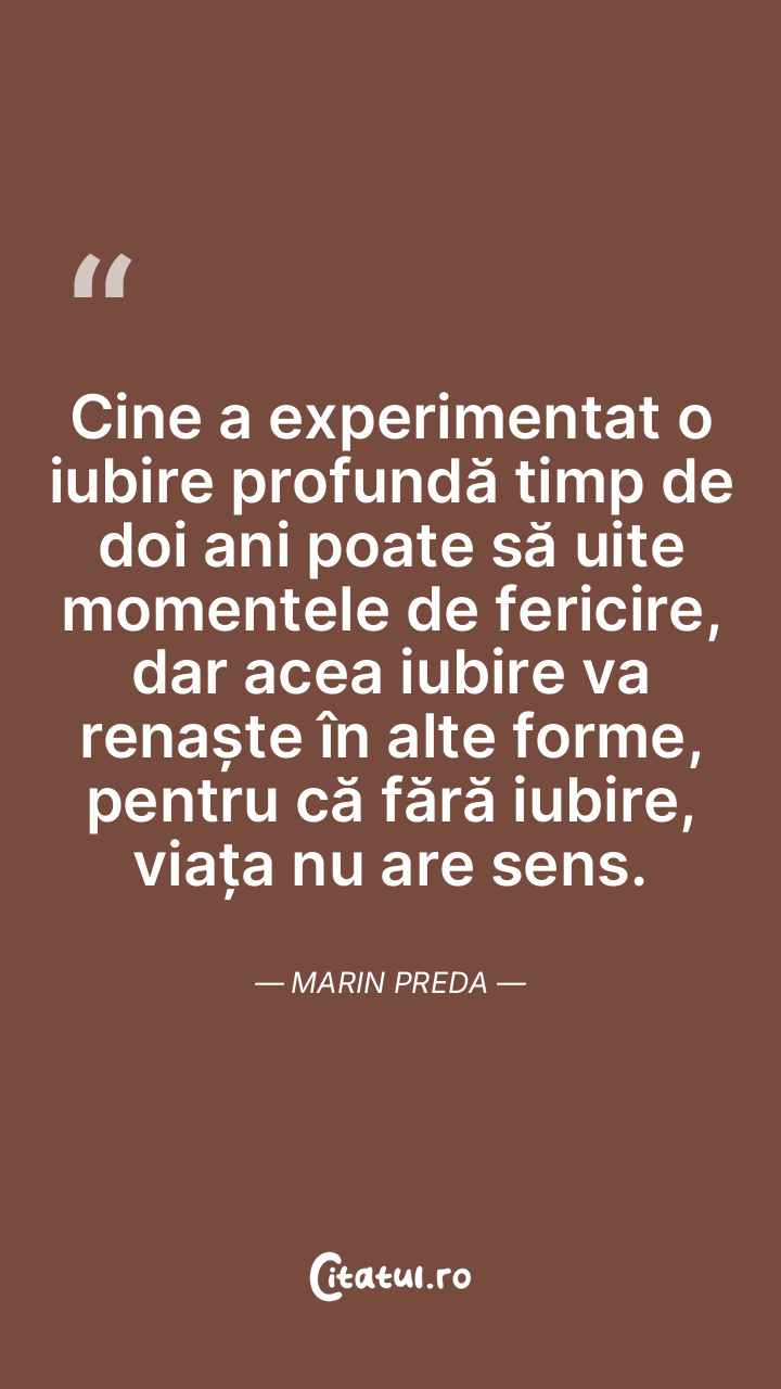 Cine a experimentat o iubire profundă timp de doi ani poate să uite momentele de fericire, dar acea iubire va renaște în alte forme, pentru că fără iubire, viața nu are sens. Marin Preda