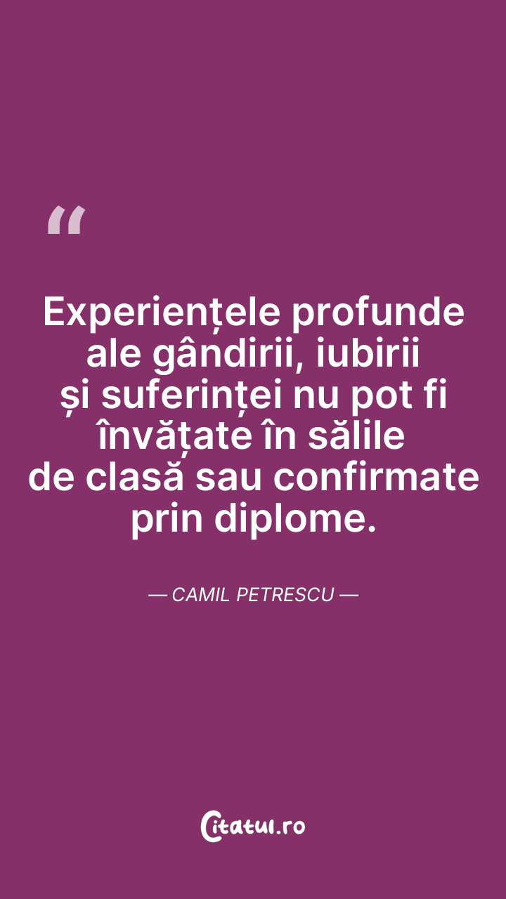 Experiențele profunde ale gândirii, iubirii și suferinței nu pot fi învățate în sălile de clasă sau confirmate prin diplome. Camil Petrescu