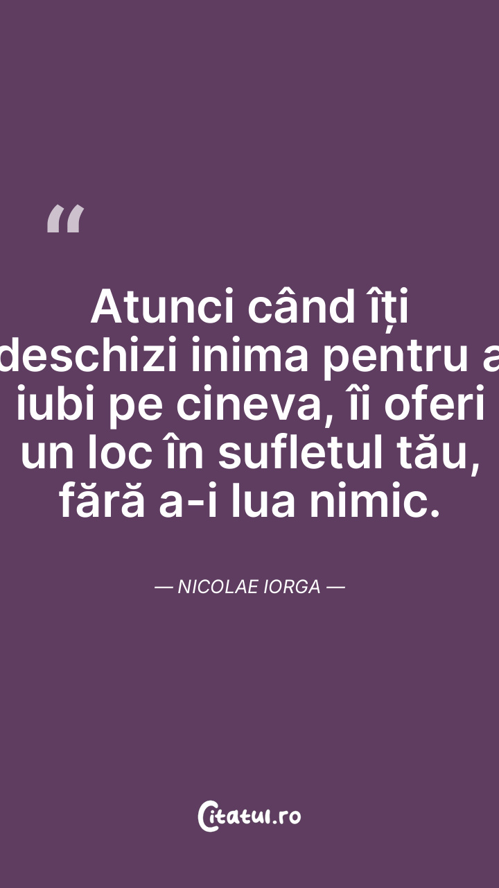 Atunci când îți deschizi inima pentru a iubi pe cineva, îi oferi un loc în sufletul tău, fără a-i lua nimic. Nicolae Iorga