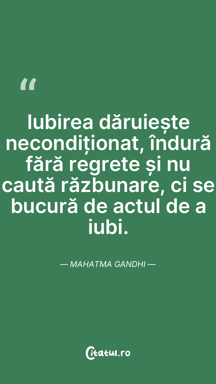 Iubirea dăruiește necondiționat, îndură fără regrete și nu caută răzbunare, ci se bucură de actul de a iubi. Mahatma Gandhi