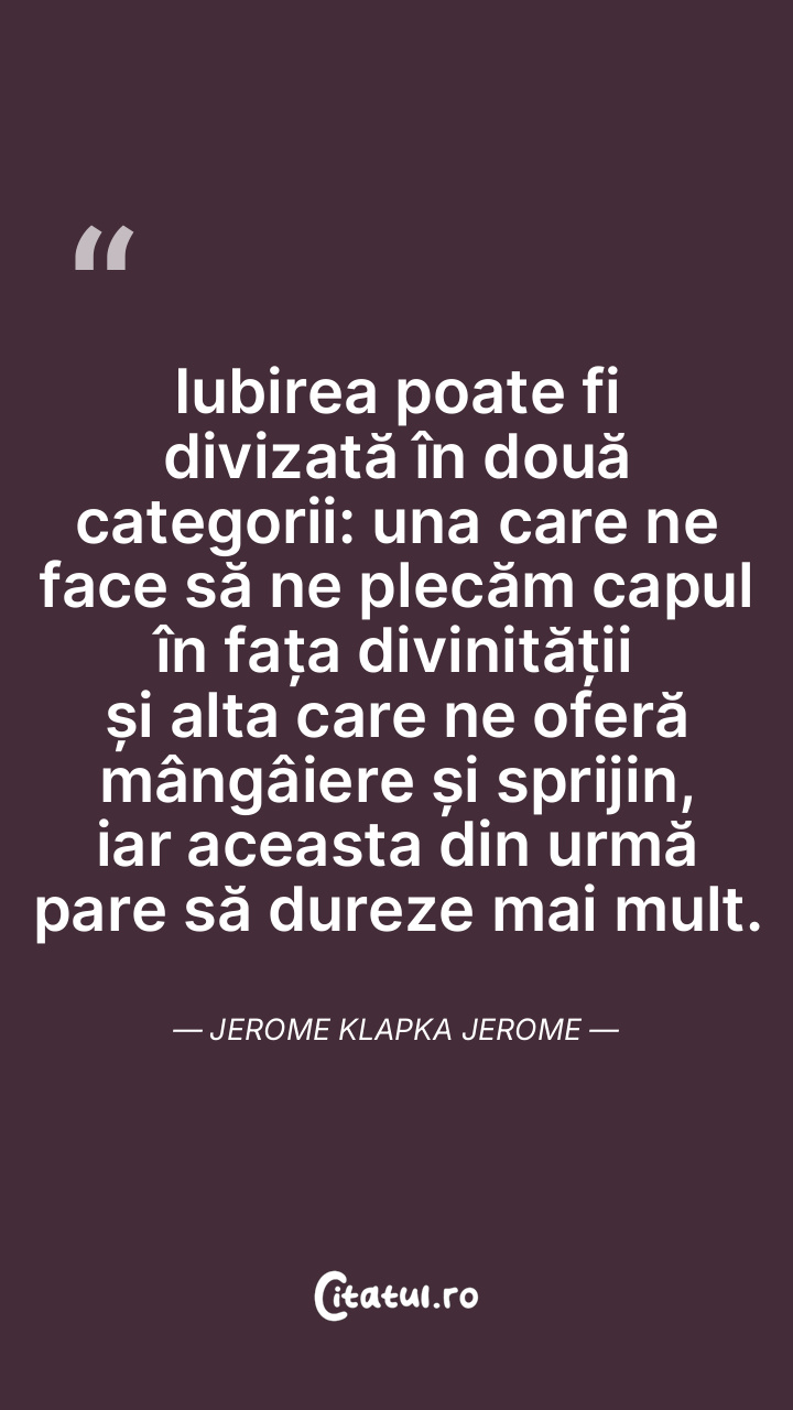 Iubirea poate fi divizată în două categorii: una care ne face să ne plecăm capul în fața divinității și alta care ne oferă mângâiere și sprijin, iar aceasta din urmă pare să dureze mai mult. Jerome Klapka Jerome