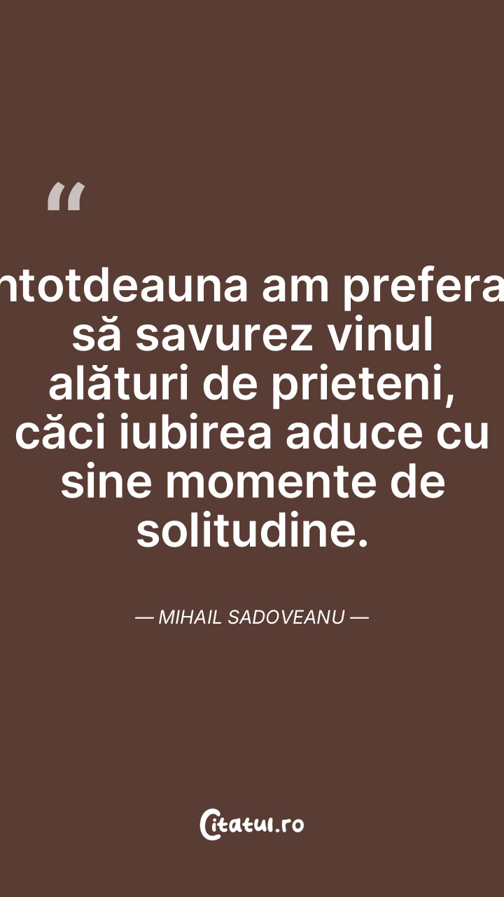 Întotdeauna am preferat să savurez vinul alături de prieteni, căci iubirea aduce cu sine momente de solitudine. Mihail Sadoveanu