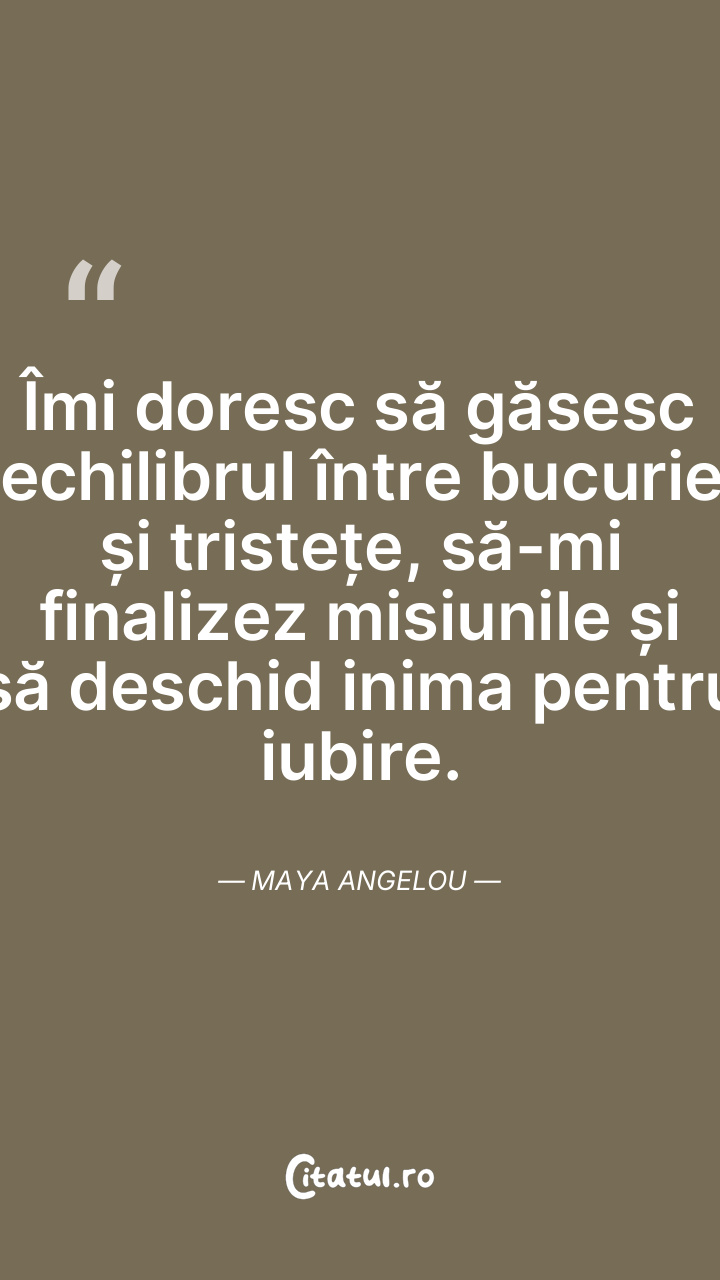 Îmi doresc să găsesc echilibrul între bucurie și tristețe, să-mi finalizez misiunile și să deschid inima pentru iubire. Maya Angelou