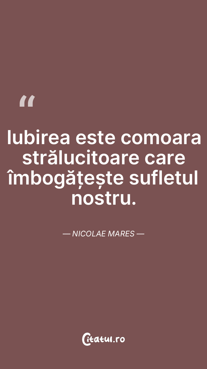Iubirea este comoara strălucitoare care îmbogățește sufletul nostru. Nicolae Mares