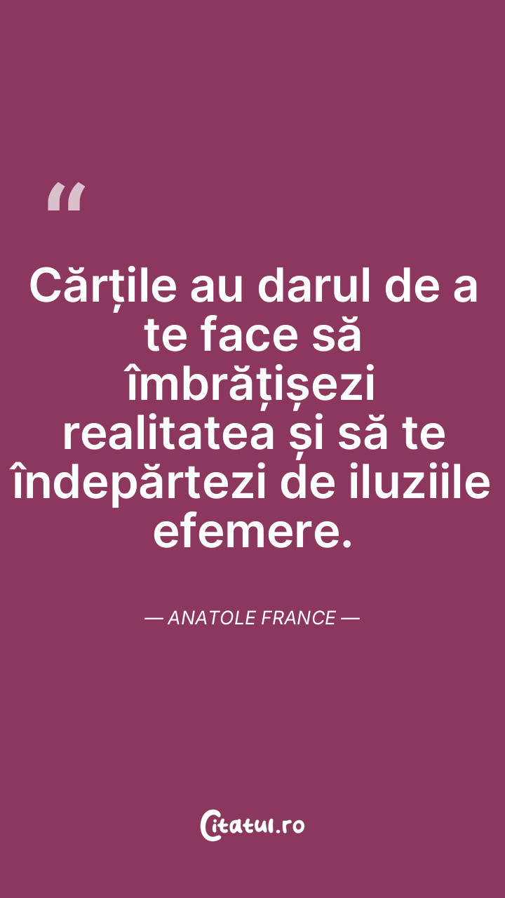 Cărțile au darul de a te face să îmbrățișezi realitatea și să te îndepărtezi de iluziile efemere. Anatole France