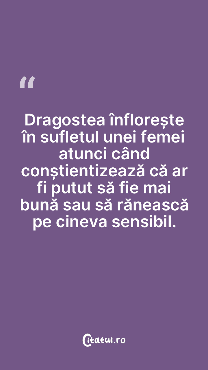 Dragostea înflorește în sufletul unei femei atunci când conștientizează că ar fi putut să fie mai bună sau să rănească pe cineva sensibil.