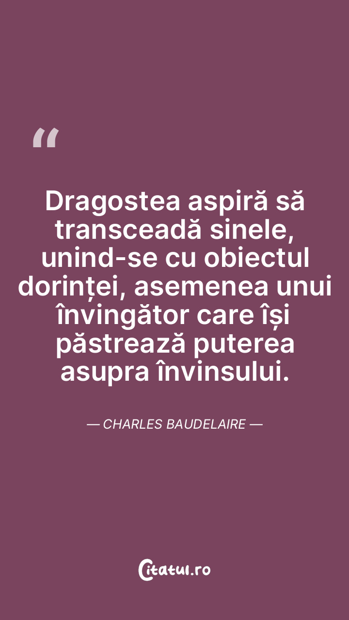Dragostea aspiră să transceadă sinele, unind-se cu obiectul dorinței, asemenea unui învingător care își păstrează puterea asupra învinsului. Charles Baudelaire