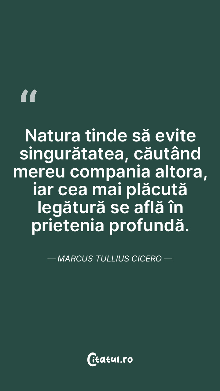 Natura tinde să evite singurătatea, căutând mereu compania altora, iar cea mai plăcută legătură se află în prietenia profundă. Marcus Tullius Cicero