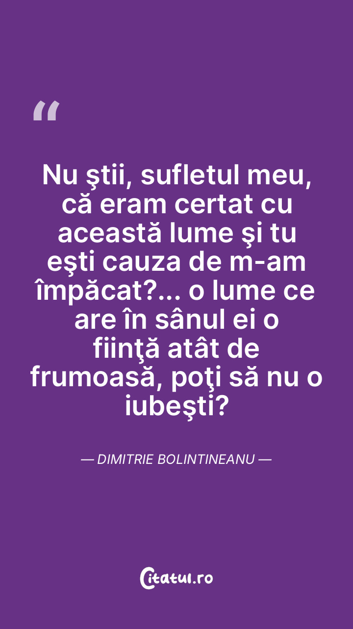 Nu ştii, sufletul meu, că eram certat cu această lume şi tu eşti cauza de m-am împăcat?... o lume ce are în sânul ei o fiinţă atât de frumoasă, poţi să nu o iubeşti? Dimitrie Bolintineanu