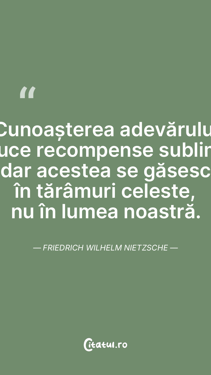 Cunoașterea adevărului aduce recompense sublime, dar acestea se găsesc în tărâmuri celeste, nu în lumea noastră. Friedrich Wilhelm Nietzsche