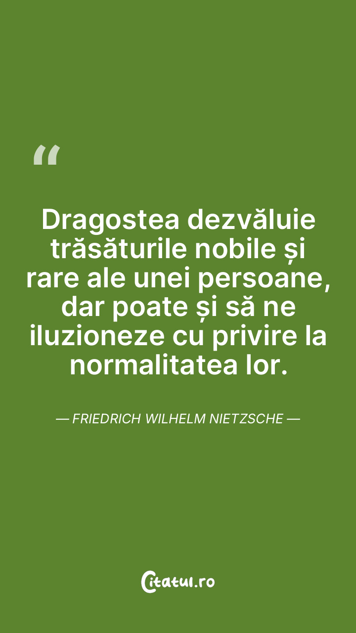 Dragostea dezvăluie trăsăturile nobile și rare ale unei persoane, dar poate și să ne iluzioneze cu privire la normalitatea lor. Friedrich Wilhelm Nietzsche