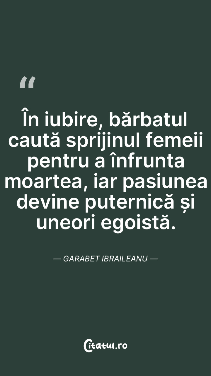 În iubire, bărbatul caută sprijinul femeii pentru a înfrunta moartea, iar pasiunea devine puternică și uneori egoistă. Garabet Ibraileanu