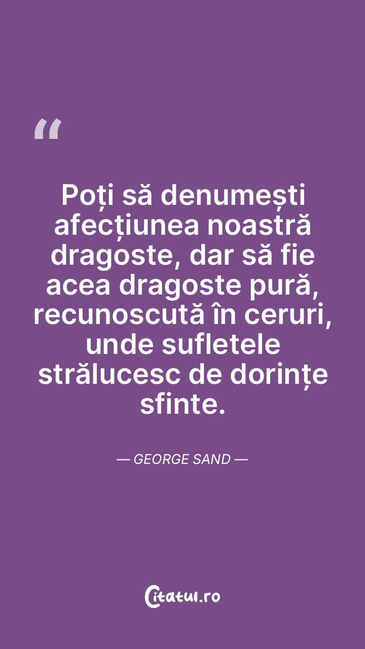 Poți să denumești afecțiunea noastră dragoste, dar să fie acea dragoste pură, recunoscută în ceruri, unde sufletele strălucesc de dorințe sfinte. George Sand