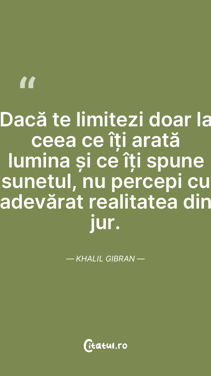 Dacă te limitezi doar la ceea ce îți arată lumina și ce îți spune sunetul, nu percepi cu adevărat realitatea din jur. Khalil Gibran