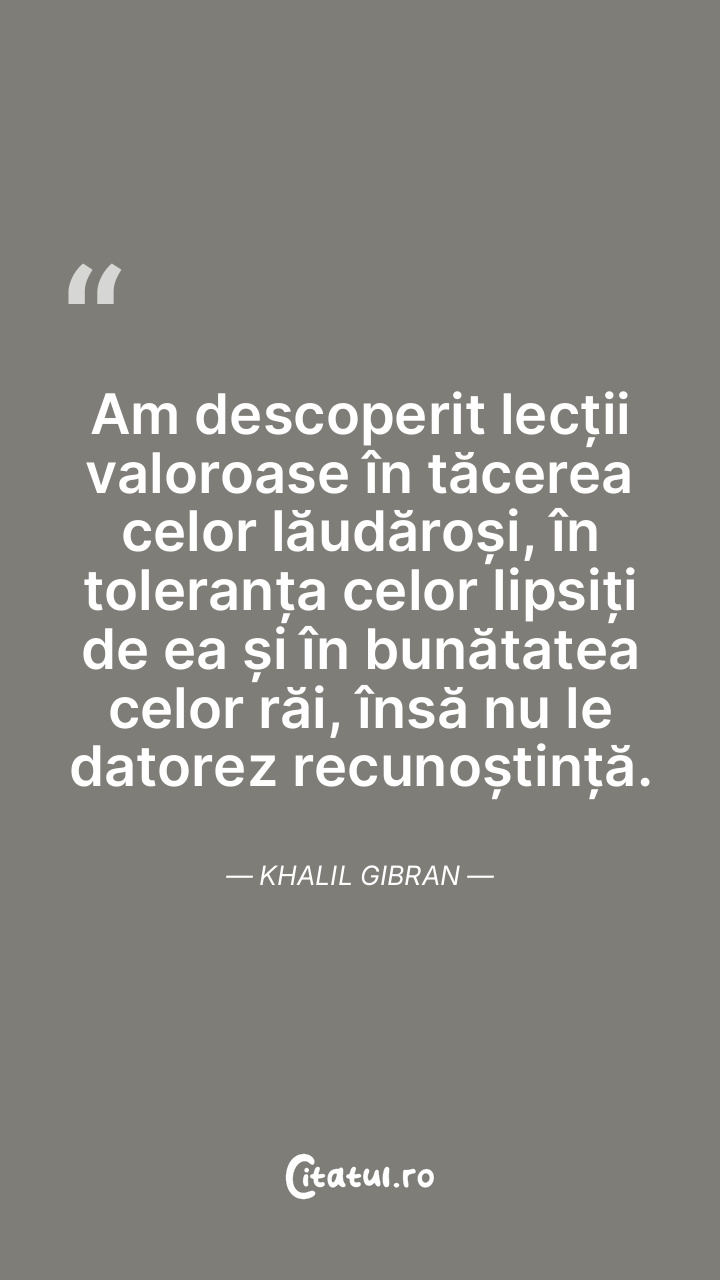 Am descoperit lecții valoroase în tăcerea celor lăudăroși, în toleranța celor lipsiți de ea și în bunătatea celor răi, însă nu le datorez recunoștință. Khalil Gibran