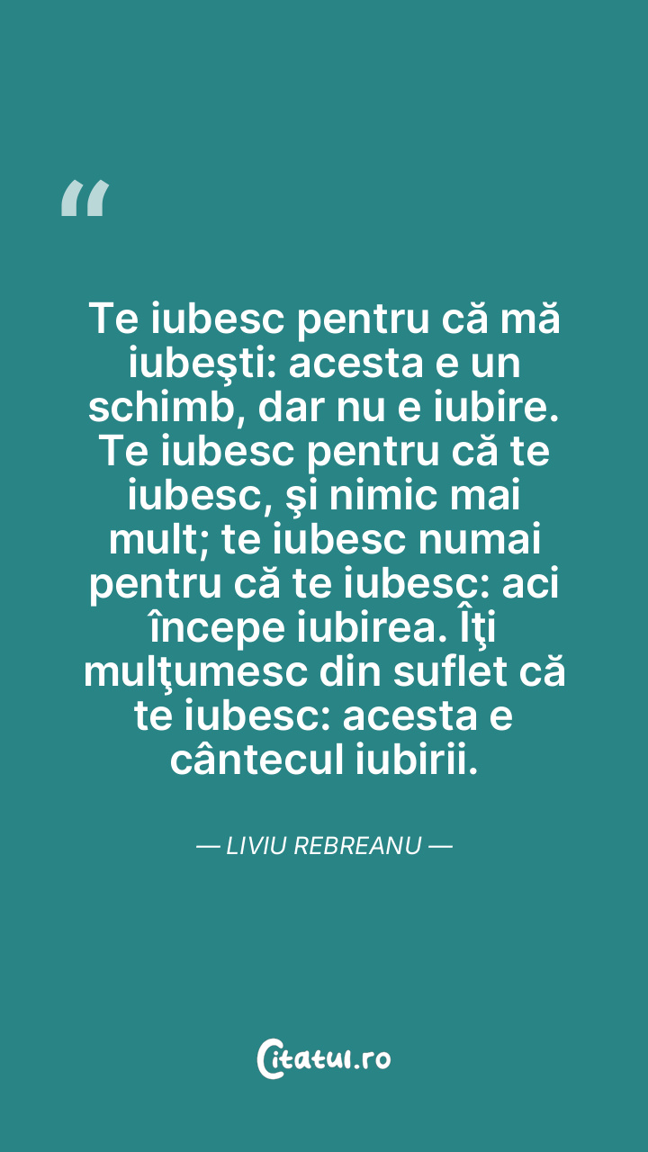 Te iubesc pentru că mă iubeşti: acesta e un schimb, dar nu e iubire. Te iubesc pentru că te iubesc, şi nimic mai mult; te iubesc numai pentru că te iubesc: aci începe iubirea. Îţi mulţumesc din suflet că te iubesc: acesta e cântecul iubirii. Liviu Rebreanu