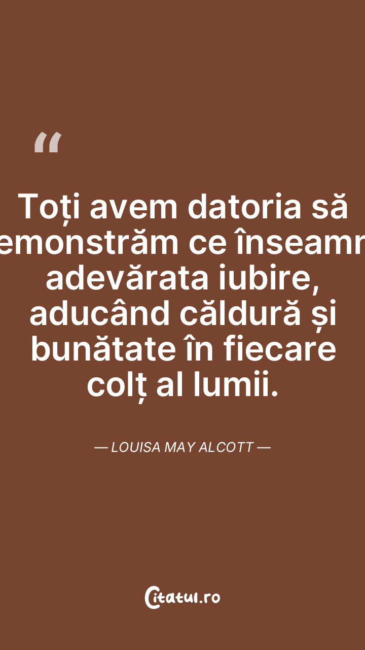 Toți avem datoria să demonstrăm ce înseamnă adevărata iubire, aducând căldură și bunătate în fiecare colț al lumii. Louisa May Alcott