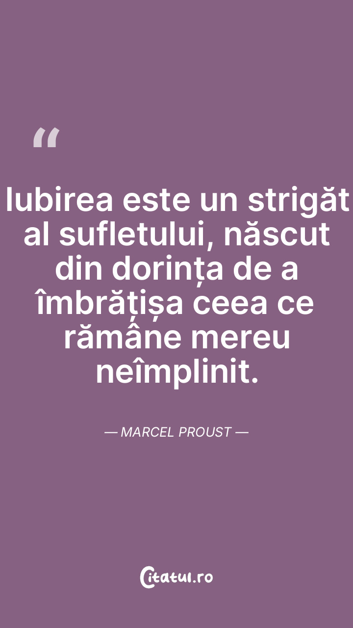 Iubirea este un strigăt al sufletului, născut din dorința de a îmbrățișa ceea ce rămâne mereu neîmplinit. Marcel Proust