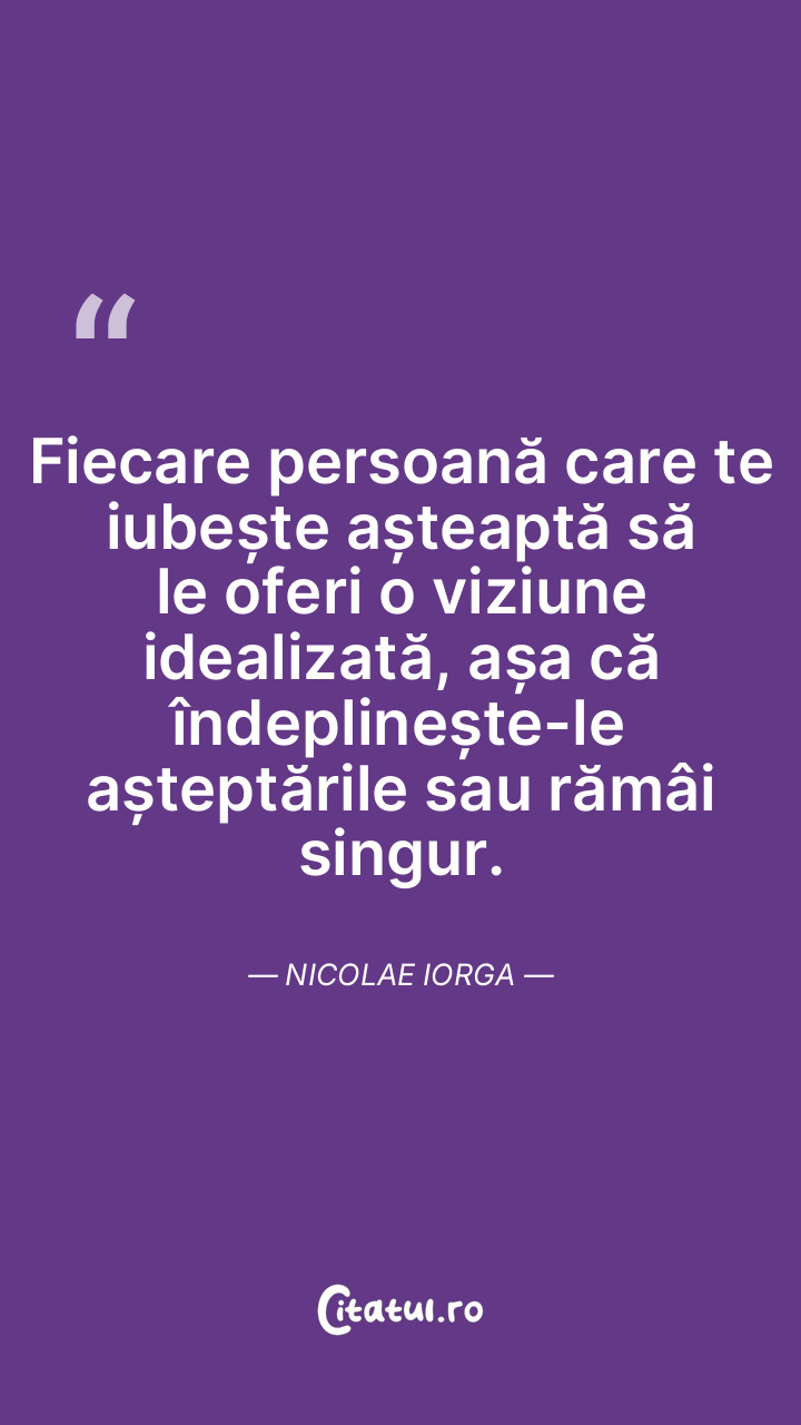 Fiecare persoană care te iubește așteaptă să le oferi o viziune idealizată, așa că îndeplinește-le așteptările sau rămâi singur. Nicolae Iorga