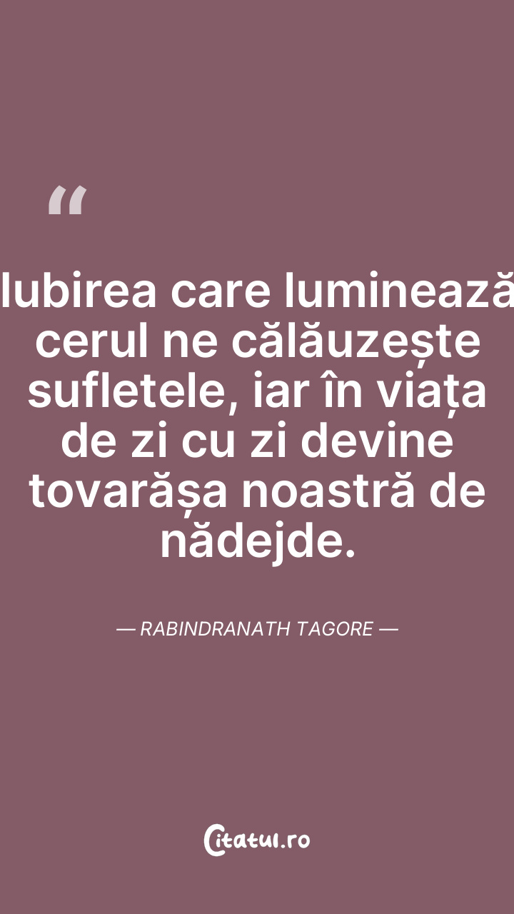 Iubirea care luminează cerul ne călăuzește sufletele, iar în viața de zi cu zi devine tovarășa noastră de nădejde. Rabindranath Tagore