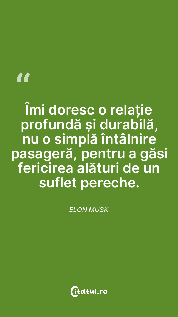 Îmi doresc o relație profundă și durabilă, nu o simplă întâlnire pasageră, pentru a găsi fericirea alături de un suflet pereche. Elon Musk
