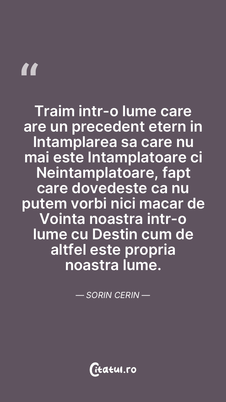 Traim intr-o lume care are un precedent etern in Intamplarea sa care nu mai este Intamplatoare ci Neintamplatoare, fapt care dovedeste ca nu putem vorbi nici macar de Vointa noastra intr-o lume cu Destin cum de altfel este propria noastra lume. Sorin Cerin