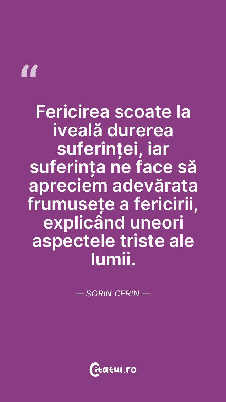 Fericirea scoate la iveală durerea suferinței, iar suferința ne face să apreciem adevărata frumusețe a fericirii, explicând uneori aspectele triste ale lumii. Sorin Cerin