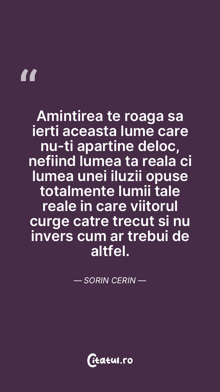Amintirea te roaga sa ierti aceasta lume care nu-ti apartine deloc, nefiind lumea ta reala ci lumea unei iluzii opuse totalmente lumii tale reale in care viitorul curge catre trecut si nu invers cum ar trebui de altfel. Sorin Cerin