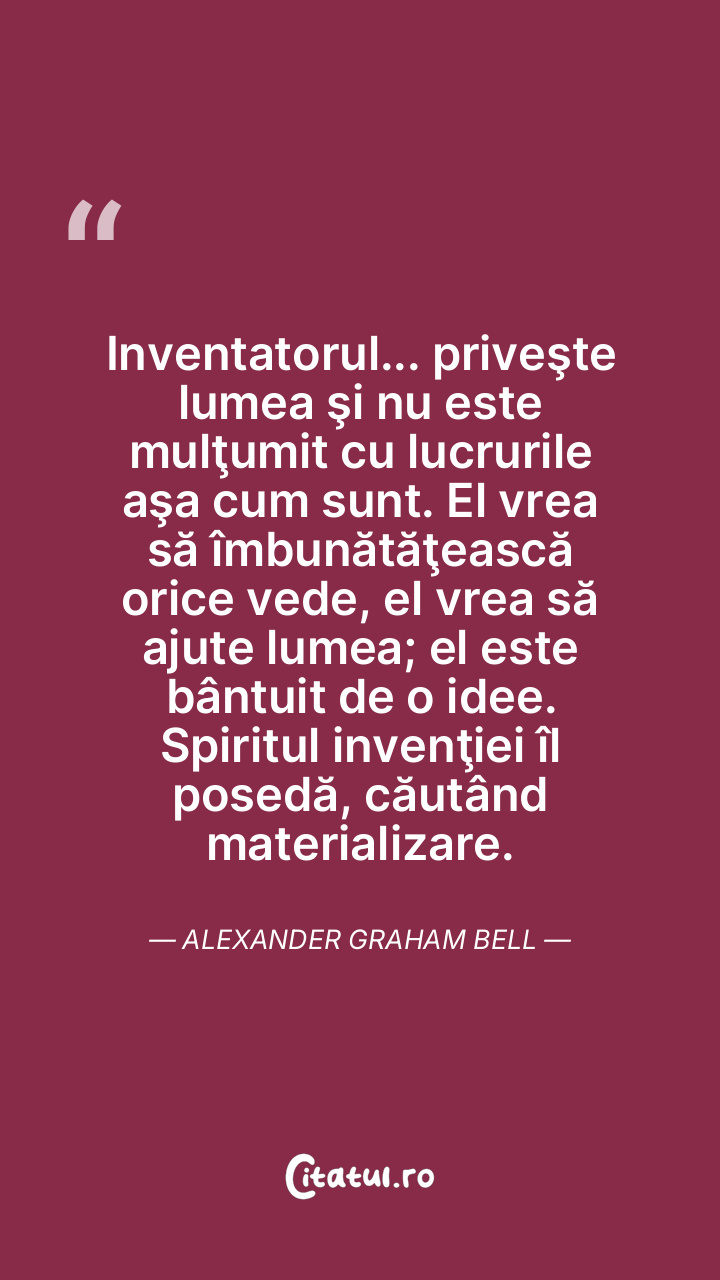 Inventatorul... priveşte lumea şi nu este mulţumit cu lucrurile aşa cum sunt. El vrea să îmbunătăţească orice vede, el vrea să ajute lumea; el este bântuit de o idee. Spiritul invenţiei îl posedă, căutând materializare. Alexander Graham Bell