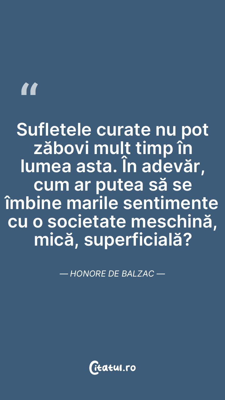 Sufletele curate nu pot zăbovi mult timp în lumea asta. În adevăr, cum ar putea să se îmbine marile sentimente cu o societate meschină, mică, superficială? Honore de Balzac