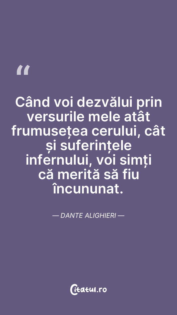 Când voi dezvălui prin versurile mele atât frumusețea cerului, cât și suferințele infernului, voi simți că merită să fiu încununat. Dante Alighieri