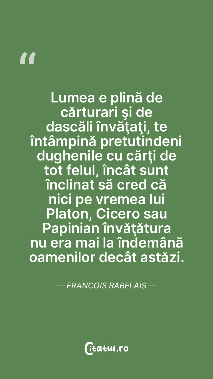 Lumea e plină de cărturari şi de dascăli învăţaţi, te întâmpină pretutindeni dughenile cu cărţi de tot felul, încât sunt înclinat să cred că nici pe vremea lui Platon, Cicero sau Papinian învăţătura nu era mai la îndemână oamenilor decât astăzi. Francois Rabelais