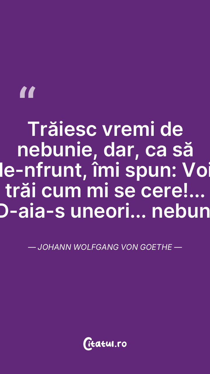 Trăiesc vremi de nebunie, dar, ca să le-nfrunt, îmi spun: Voi trăi cum mi se cere!... D-aia-s uneori... nebun. Johann Wolfgang von Goethe