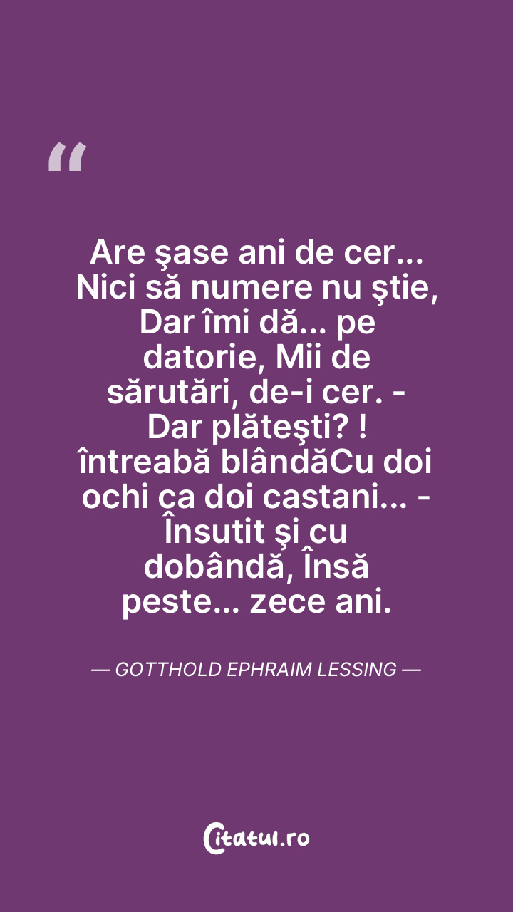 Are şase ani de cer... Nici să numere nu ştie, Dar îmi dă... pe datorie, Mii de sărutări, de-i cer. - Dar plăteşti? ! întreabă blândăCu doi ochi ca doi castani... - Însutit şi cu dobândă, Însă peste... zece ani. Gotthold Ephraim Lessing