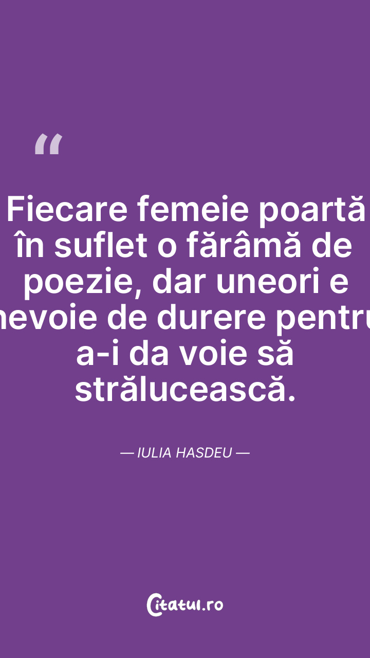 Fiecare femeie poartă în suflet o fărâmă de poezie, dar uneori e nevoie de durere pentru a-i da voie să strălucească. Iulia Hasdeu