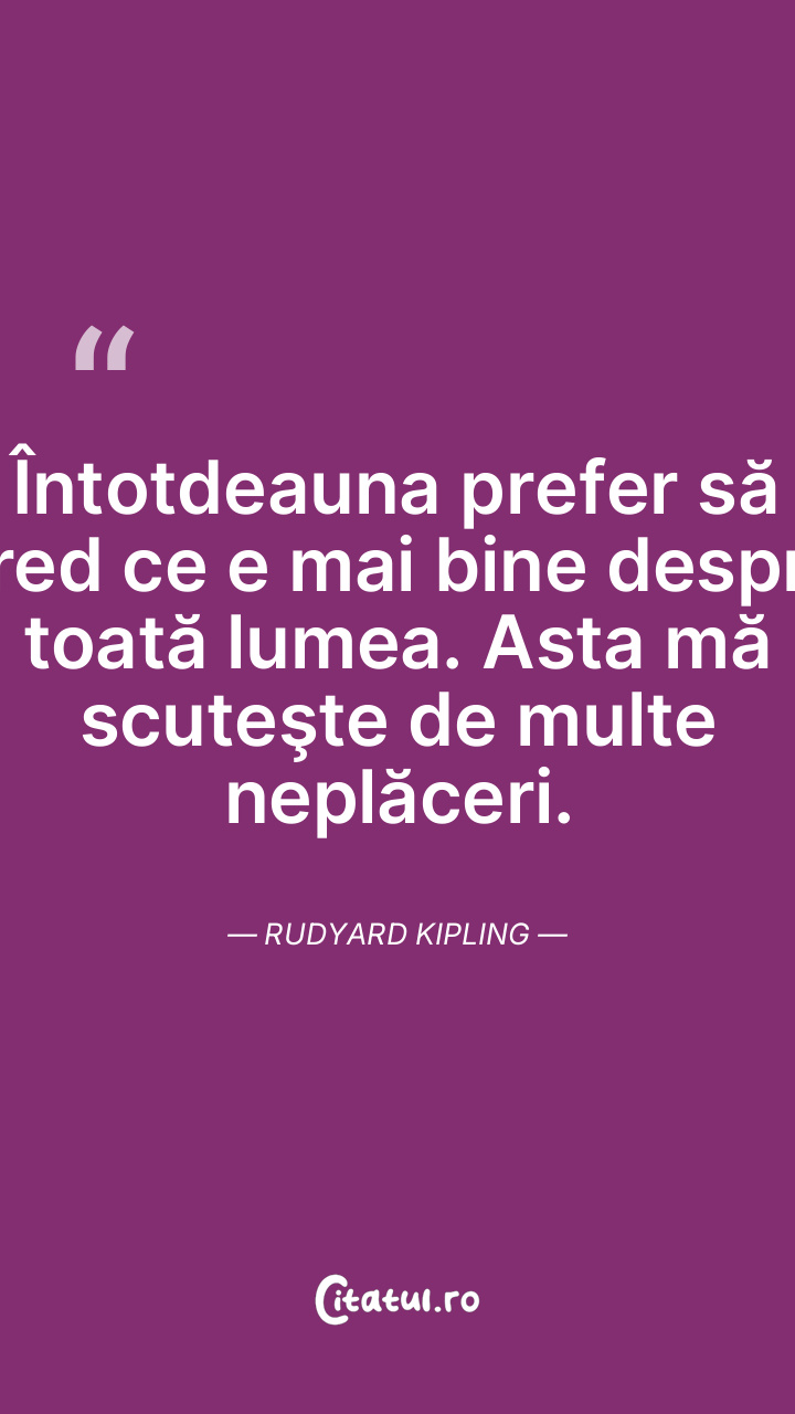 Întotdeauna prefer să cred ce e mai bine despre toată lumea. Asta mă scuteşte de multe neplăceri. Rudyard Kipling