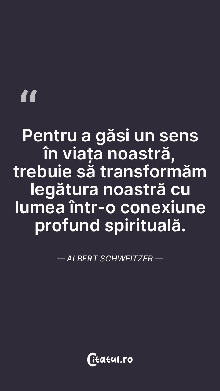 Pentru a găsi un sens în viața noastră, trebuie să transformăm legătura noastră cu lumea într-o conexiune profund spirituală. Albert Schweitzer