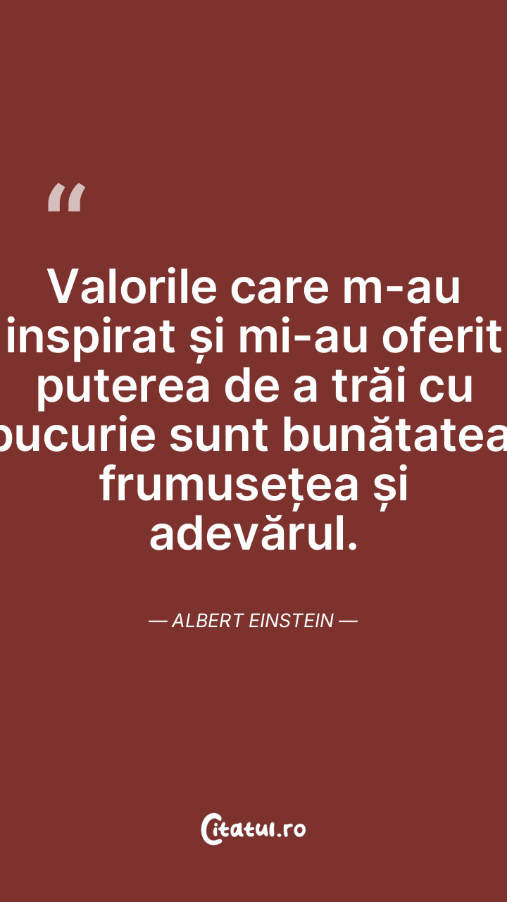 Valorile care m-au inspirat și mi-au oferit puterea de a trăi cu bucurie sunt bunătatea, frumusețea și adevărul. Albert Einstein