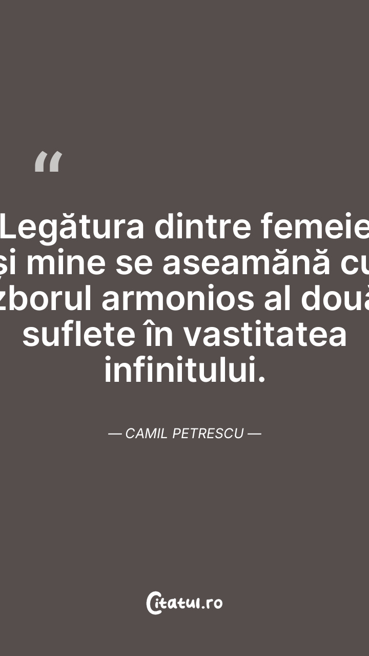 Legătura dintre femeie și mine se aseamănă cu zborul armonios al două suflete în vastitatea infinitului. Camil Petrescu