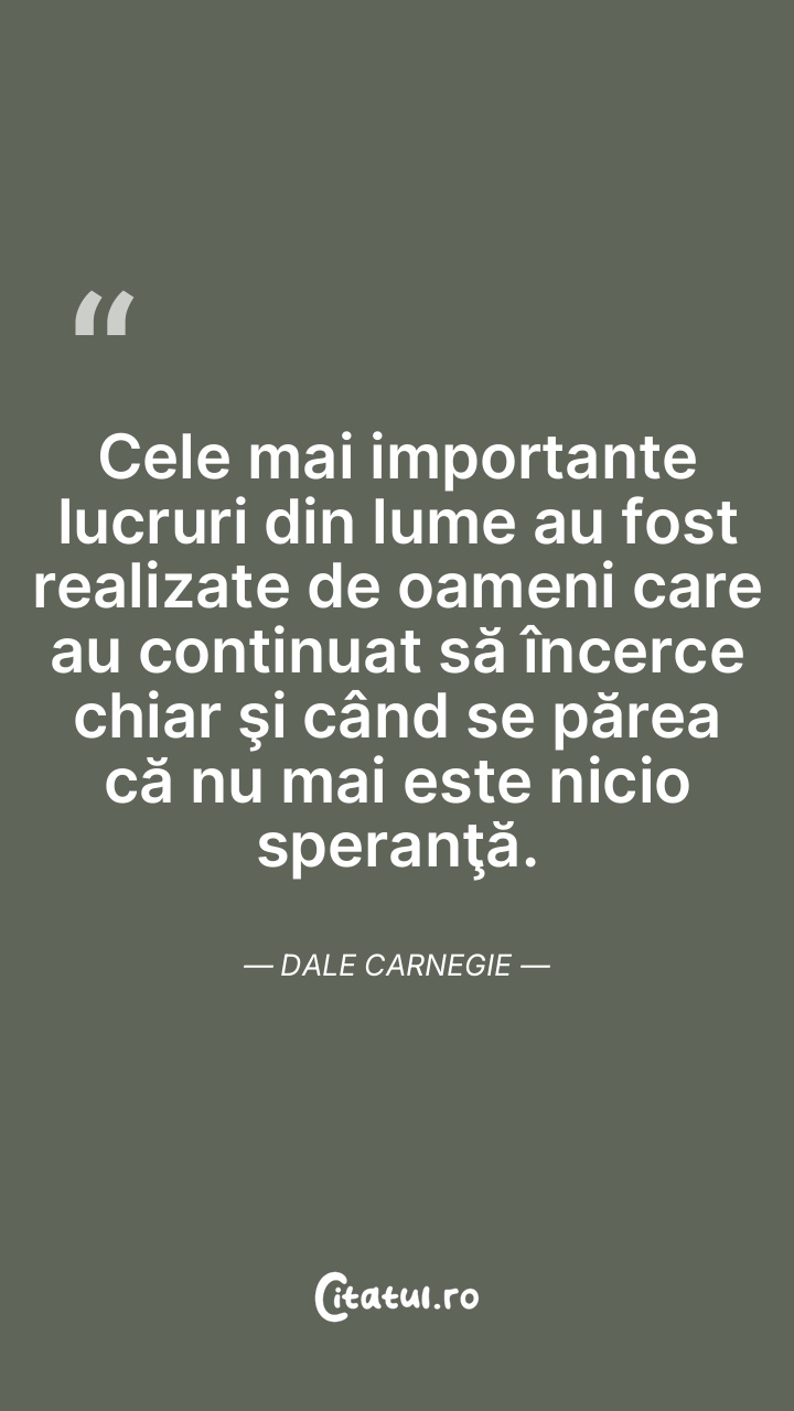 Cele mai importante lucruri din lume au fost realizate de oameni care au continuat să încerce chiar şi când se părea că nu mai este nicio speranţă. Dale Carnegie