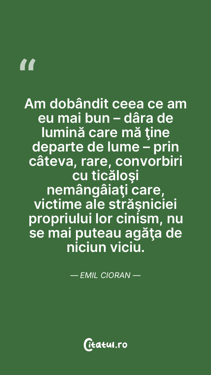 Am dobândit ceea ce am eu mai bun – dâra de lumină care mă ţine departe de lume – prin câteva, rare, convorbiri cu ticăloşi nemângâiaţi care, victime ale străşniciei propriului lor cinism, nu se mai puteau agăţa de niciun viciu. Emil Cioran