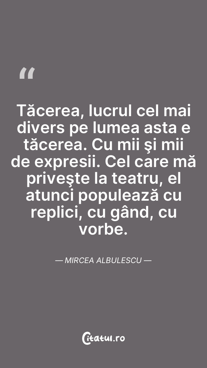 Tăcerea, lucrul cel mai divers pe lumea asta e tăcerea. Cu mii şi mii de expresii. Cel care mă priveşte la teatru, el atunci populează cu replici, cu gând, cu vorbe. Mircea Albulescu