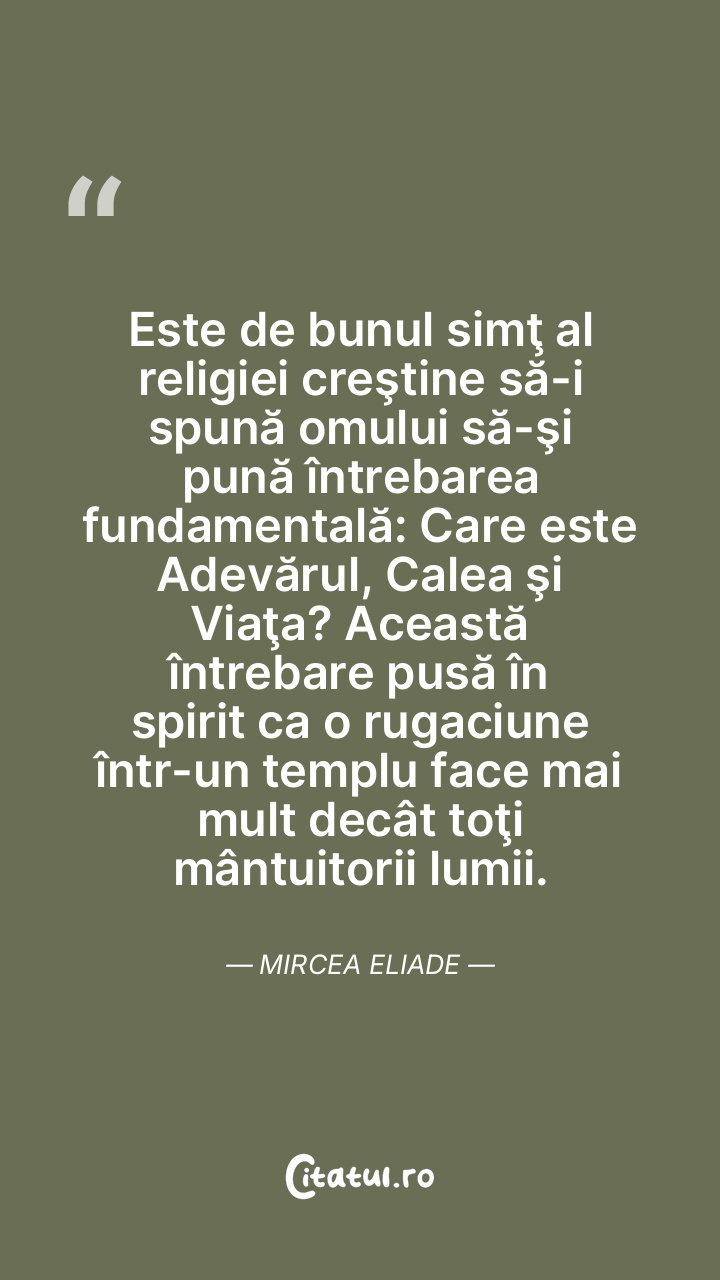 Este de bunul simţ al religiei creştine să-i spună omului să-şi pună întrebarea fundamentală: Care este Adevărul, Calea şi Viaţa? Această întrebare pusă în spirit ca o rugaciune într-un templu face mai mult decât toţi mântuitorii lumii. Mircea Eliade