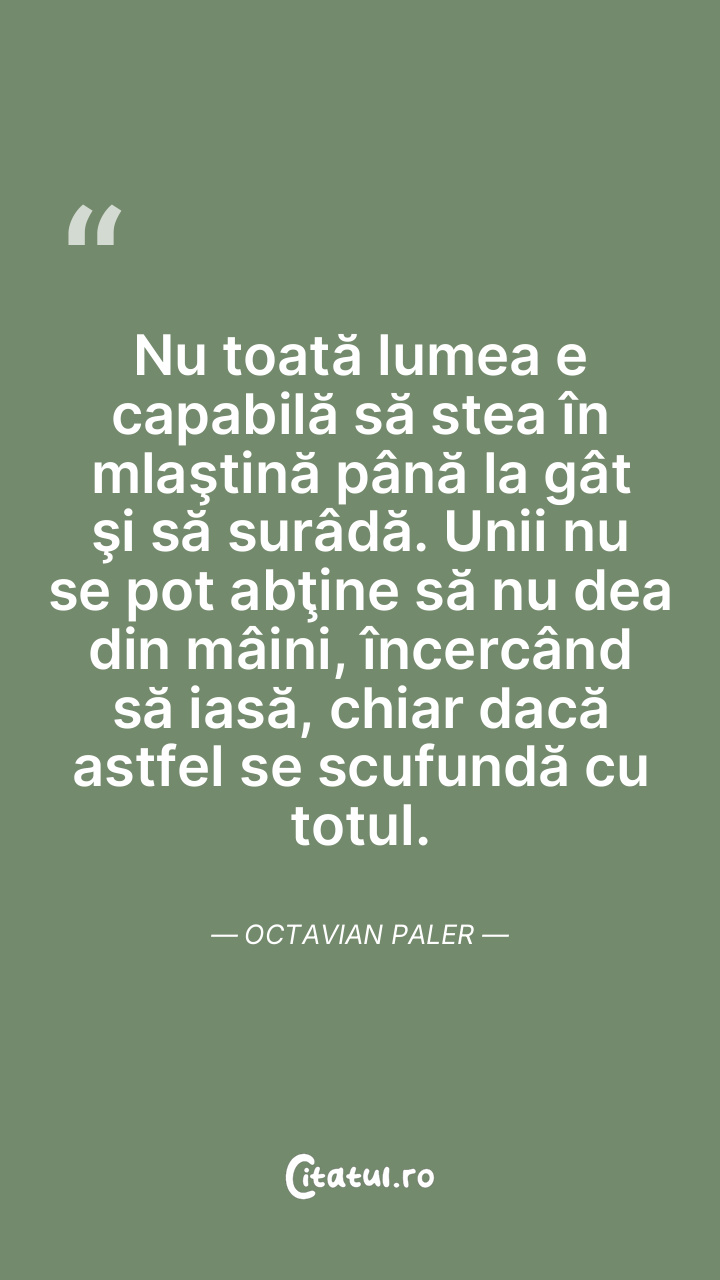 Nu toată lumea e capabilă să stea în mlaştină până la gât şi să surâdă. Unii nu se pot abţine să nu dea din mâini, încercând să iasă, chiar dacă astfel se scufundă cu totul. Octavian Paler