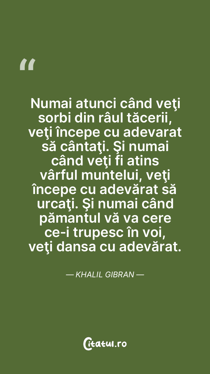 Numai atunci când veţi sorbi din râul tăcerii, veţi începe cu adevarat să cântaţi. Şi numai când veţi fi atins vârful muntelui, veţi începe cu adevărat să urcaţi. Şi numai când pămantul vă va cere ce‑i trupesc în voi, veţi dansa cu adevărat. Khalil Gibran