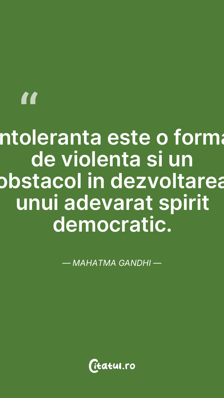 Intoleranta este o forma de violenta si un obstacol in dezvoltarea unui adevarat spirit democratic. Mahatma Gandhi