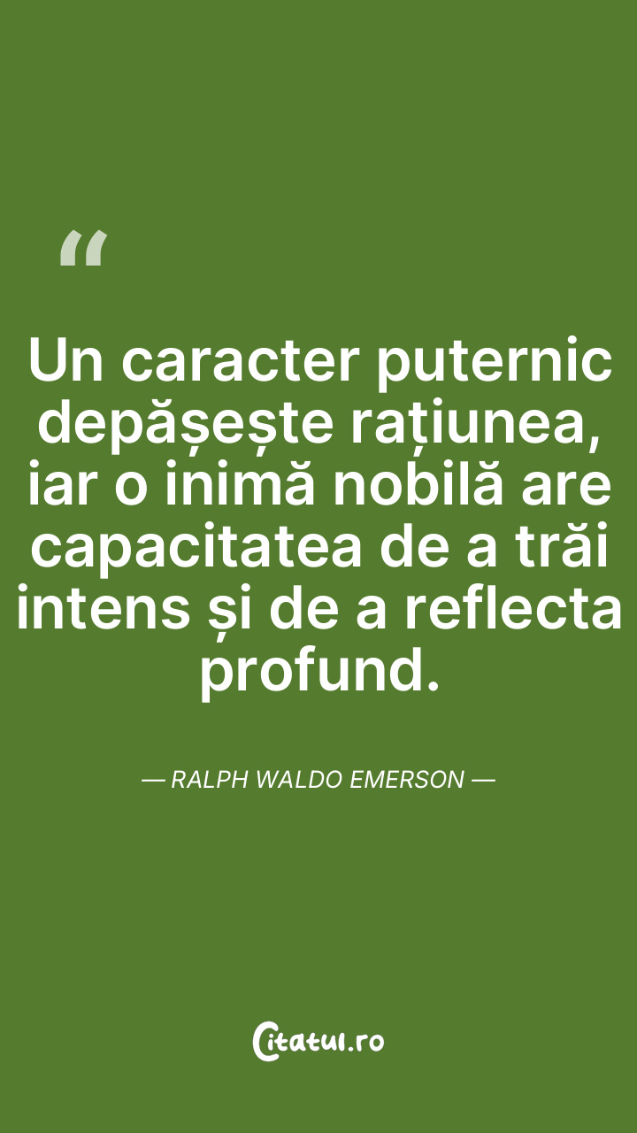 Un caracter puternic depășește rațiunea, iar o inimă nobilă are capacitatea de a trăi intens și de a reflecta profund. Ralph Waldo Emerson