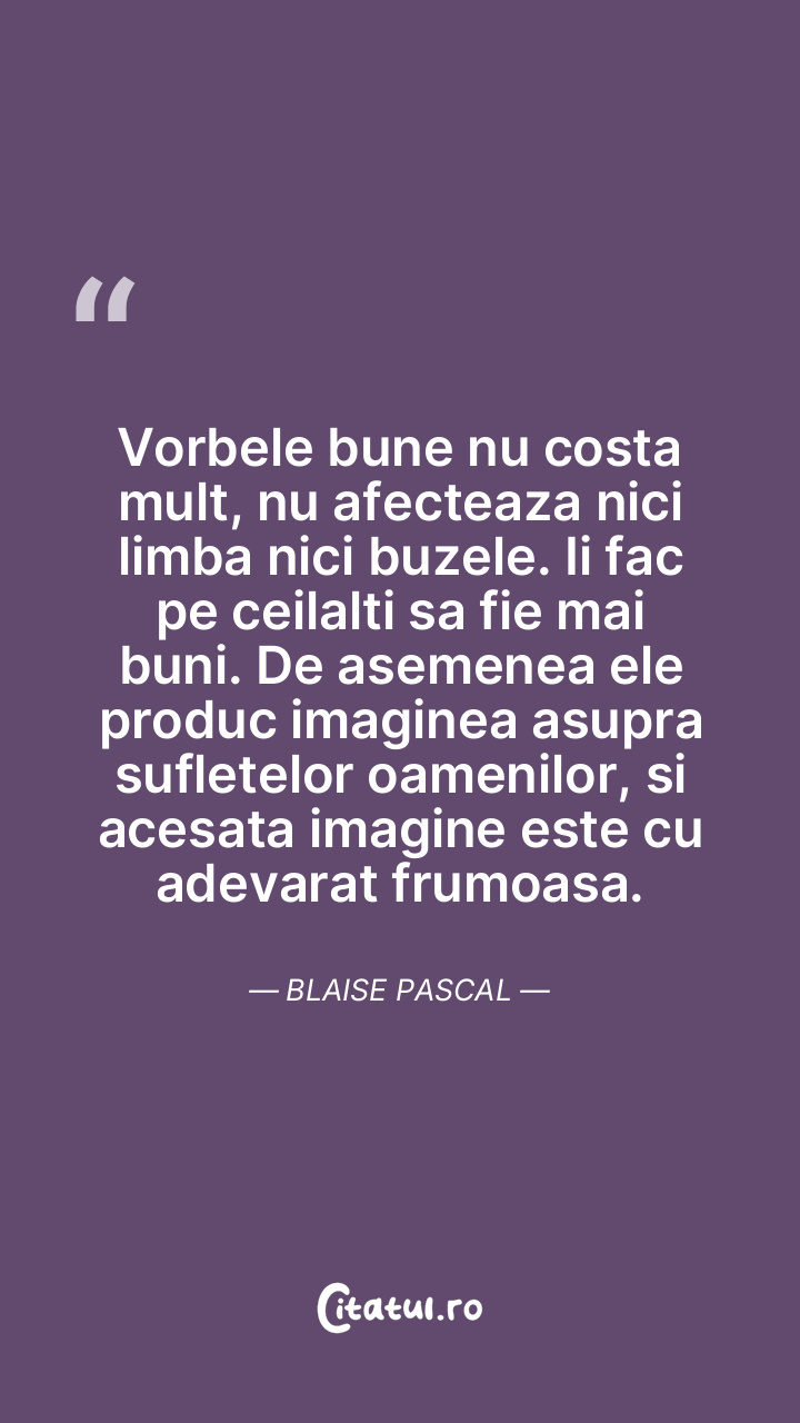 Vorbele bune nu costa mult, nu afecteaza nici limba nici buzele. Ii fac pe ceilalti sa fie mai buni. De asemenea ele produc imaginea asupra sufletelor oamenilor, si acesata imagine este cu adevarat frumoasa. Blaise Pascal