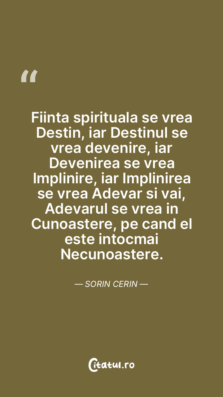 Fiinta spirituala se vrea Destin, iar Destinul se vrea devenire, iar Devenirea se vrea Implinire, iar Implinirea se vrea Adevar si vai, Adevarul se vrea in Cunoastere, pe cand el este intocmai Necunoastere. Sorin Cerin